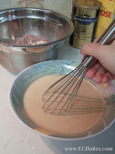 把B料放進另一鋼盤拌勻. 將濕料倒進乾料粉牆中, 用膠刮輕手攪拌至剛好混合. 不要過度攪拌否則鬆餅質地會過實. 此時麵糊應是杰身而且並不順滑