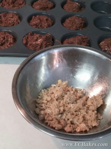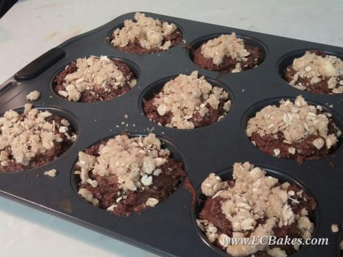 Divide batter evenly among greased muffin pan (I use a spring-loaded ice cream scoop). Sprinkle topping over the batter.
