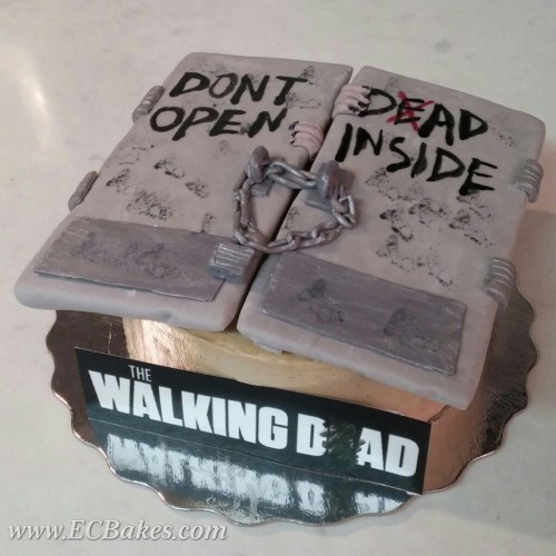 I never watched a single episode of The Walking Dead series until a friend of mine asked me to make a birthday cake for her hubby, who was a fan of this TV series. After some Goggling I decided to make this cake with a twist of humor. I actually made a log but unfortunately there wasn’t enough space to tuck it under the door handle.