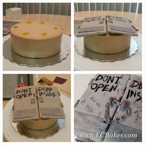 淺灰糖皮壓薄後切成比咭紙大一點的長方形, 在咭紙上抹點水或固體菜油, 包上糖皮, 掃平並收好接口. 淺灰糖皮加少少啡色色膏搓勻成為喪屍皮膚顔色, 搓幼條切段做成八隻手指, 用水黏在門邊. 黑色色膏加水開稀成顔料, 用畫筆沾顔料在門上寫字, 以牙簽沾顔料在手指上畫上指甲. 放乾