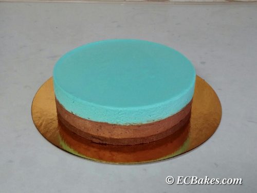 Prepare a 7-inch double chocolate mousse cake (or any light colored mousse cake or cheesecake). Color the white chocolate mousse blue by adding some blue food coloring (I used americolor sky blue). After the mousse has set, unmold it and place it on a cake board. You may glue the cake to the cake board with melted chocolate to keep it from sliding.