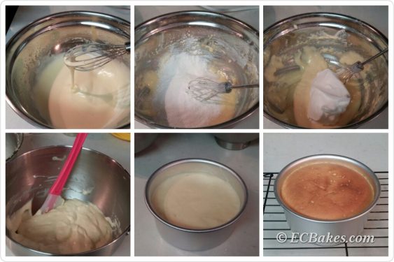這是EC的分蛋海綿蛋糕做法,失敗率十分低!EC的做法是將蛋白打成蛋白霜,到最後才與麵糊混合避免消泡,蛋黃在打發過程中加入了暖牛奶協助打成蓬鬆的蛋黃糊。EC將加材料的傳統次序改良了,牛油溶液提前加入,並與粉類分次地交替混合(就好像做美式牛油蛋糕一樣),這些方法大大地減少了麵糊消泡、出筋、粉粒的出現及牛油沉底的情況,蛋糕比全蛋法海綿蛋糕更鬆更軟。想蛋糕更紮實的可增加麵粉份量或使用中筋麵粉,若做buttercream或翻糖蛋糕底,EC一般會加添兩至三成麵粉,所以大家亦可按需要自行調整麵粉份量或使用不同麵粉。