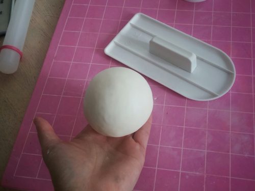 Knead white fondant until pliable. Dust silicon mat with cornstarch then roll out fondant thinly with a rolling pin. Apply some water to the styrofoam ball and cover it with fondant. Smooth all seams and edges with a fondant smoother or by hand until even and smooth.