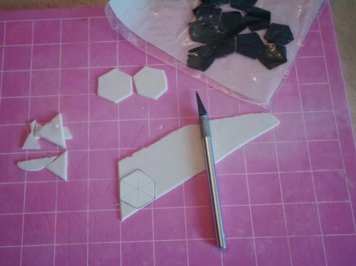 Knead black and white fondant until pliable. Roll out fondant thinly on the dusted mat. Using the templates, cut out 12 black pentagons and 20 white hexagons with a craft knife. Keep shapes that are not yet in used in a food storage bag or cover them with plastic wrap to prevent drying.