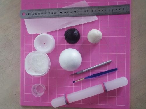 Knead white fondant until pliable. Dust silicon mat with cornstarch then roll out fondant thinly with a rolling pin. Apply some water to the styrofoam ball and cover it with fondant. Smooth all seams and edges with a fondant smoother or by hand until even and smooth.