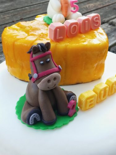 Knead a pinch of tylose powder into the green fondant. Roll out fondant thinly then cut out a circle with a round scallop cutter. Glue the horse on top. Take some black fondant strings and pinch the top together to make the horse’s tail. Attach to the bottom of the horse with water. I also made a number 2 to represent the age of the birthday girl. Let the horse dry in a cool place overnight.