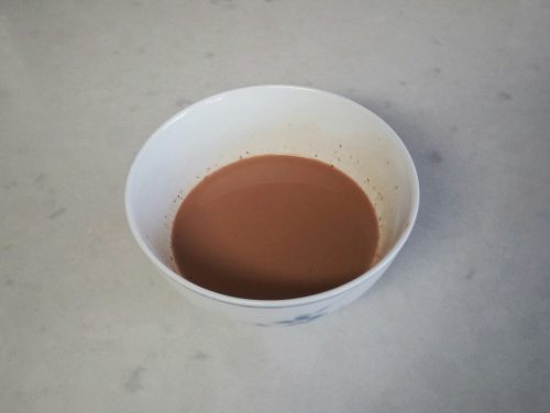 牛奶放小鍋中用小火煮滾後離火,剪開茶包倒進茶葉後蓋上蓋子待十分鐘,放涼後用濾網把茶葉隔掉,取55克奶茶備用。