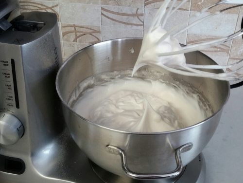 用電動打蛋器或座枱式攪拌器(使用打蛋器配件)將蛋白打至起粗泡,加入他他粉繼續打至蛋白組織變細密,分次加糖打至有光澤及企身,蛋白霜拉起時呈尖長而末端僅輕微下垂狀。