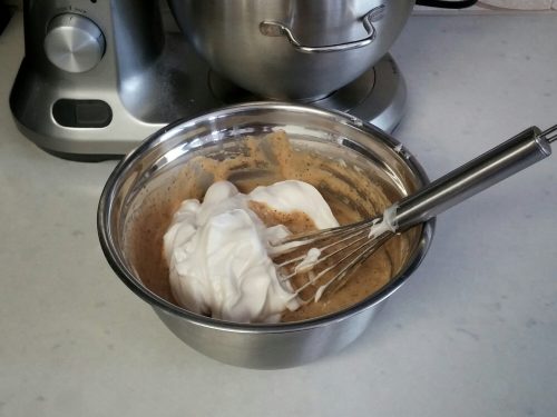 Scoop about one third of the meringue into the yolk batter and fold with a whisk to lighten. Then scrape this back into the bowl of meringue. Fold gently and thoroughly (so you don’t deflate the meringue) with a spatula until you see no streaks of white.