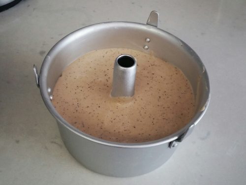 Pour batter into the tube pan. Tap pan against the kitchen countertop several times to get rid of any large air bubbles. Smooth top with an offset spatula.