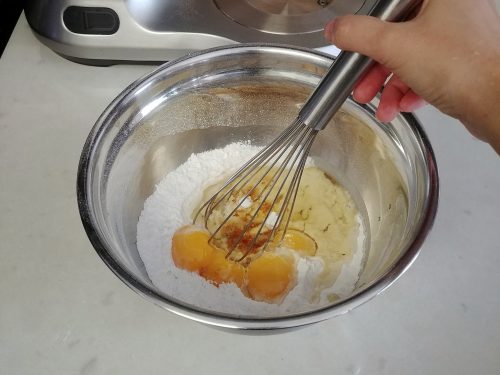 Separate the eggs and place the egg whites In a clean mixing bowl (I usually wipe the bowl and the wire beater with paper towel dampened with vinegar or lemon juice to remove traces of grease). Preheat oven to 325ºF/160ºC.