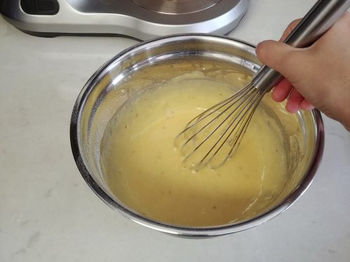 將三分一蛋白霜混入蛋黃糊中用蛋拂以切拌方法充份拌勻,再倒回蛋白霜鋼盆中輕手用膠刮以切拌方法混合至麵糊成均一顔色,盡量輕手並快手完成混合以免蛋白霜消泡。