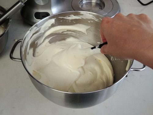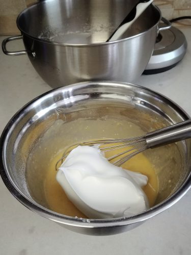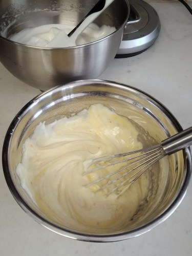 Scoop about one third of the meringue into the yolk batter and fold with a whisk to lighten. Then scrape this back into the bowl of meringue. Fold gently and thoroughly (so you don’t deflate the meringue) with a spatula until homogeneous.