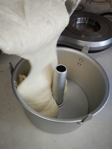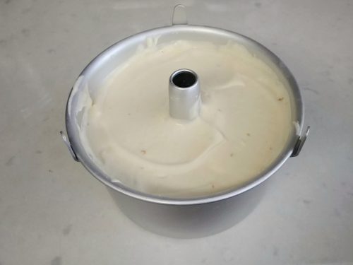 Pour batter into the ungreased tube pan. Tap pan against the kitchen countertop several times to get rid of any large air bubbles. Smooth top with an offset spatula.