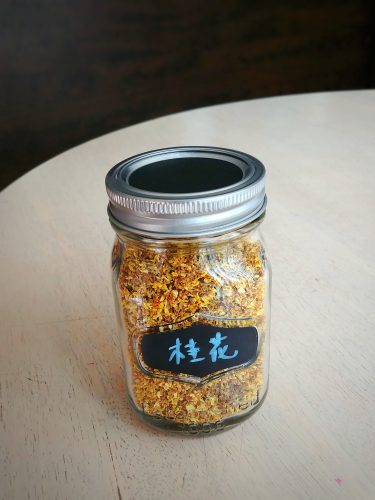 Osmanthus flower has a light and refreshing aroma that is reminiscent of sweet apricots. The flowers are often added to dessert and tea to enhance flavor. My childhood acquaintance with Osmanthus came from the Chinese legend about Mid Autumn Festival in which Wu Gang, a woodcutter, was made to chop down a magical, self healing osmanthus tree in the Moon Palace from the moon as a lifetime punishment by the Jade Emperor. My dried osmanthus flower didn’t come from the magical tree but from my local Chinese herb store. I spent CAD$5 for a palm-sized bag and the store owner taught me to transfer the dried flowers to an airtight glass container after opening in order to preserve the fragrance. Now I keep my flowers in a mason jar. it would probably last for some time as only a small amount of buds is required each time