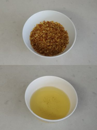 Pick out the impurities from the osmanthus flower if there’s any. Pour hot water over the buds and steep for 5 minutes. Strain the buds and measure 55 g of the osmanthus liquid. Set aside to cool.
