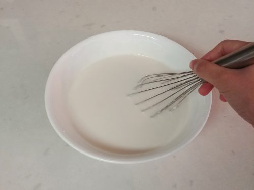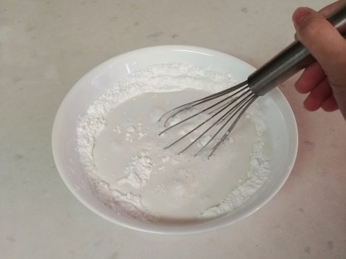 包上保鮮紙或蓋上微波爐適用餐蓋,放入微波爐高火加熱兩分鐘,此時混合物邊緣呈凝固狀但中央仍是奶白色的粉漿,取出以沾了水的膠刮拌匀,蓋好放回微波爐加熱一分鐘,取出再以膠刮拌匀,若麵糰仍有粉漿並未成糰可以繼續以每次三十秒加熱至熟,微波爐型號及烹調火力不同(EC的微波爐是1100W),請自行調整加熱時間,不用微波爐可將粉漿放蒸碟中隔水蒸約二十分鐘至熟。