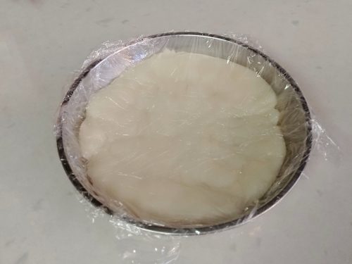 刮出粉糰轉放另一碟子內攤平,以保鮮紙緊貼表面包好防乾,待粉糰不燙手後帶上即棄膠手套揉搓粉糰至光滑有彈性,重新包好放涼至室溫備用。