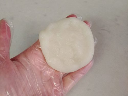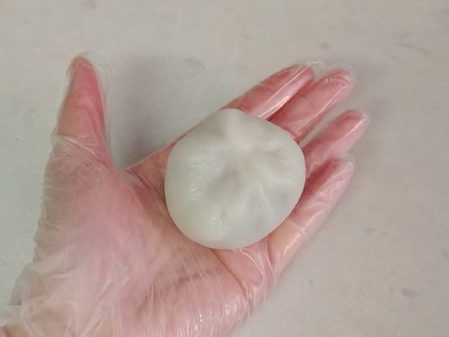 Scrap dough into another plate. Flatten dough and cover the surface with plastic wrap to prevent dough from drying out. When the dough has cooled slightly, put on disposable gloves and knead dough until it is smooth and elastic. Keep covered and let cool to room temperature.