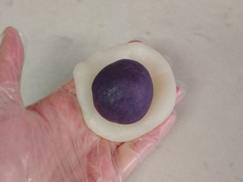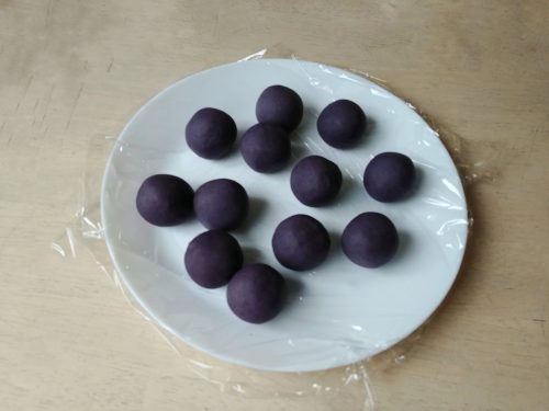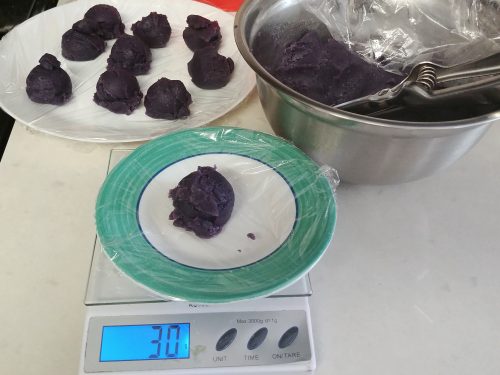 Divide purple sweet potato filling into 14 portions of 30 g each. Roll each into a ball (wear disposable gloves to prevent sticking). Cover and refrigerate for 10 minutes until firm.