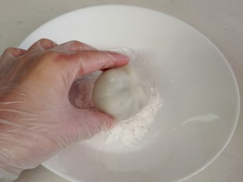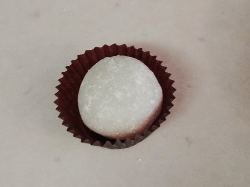 Place potato starch in a plate and set aside for coating. Measure 40 g of mochi dough. Working with both hands,flatten dough into a disc that is thinner around the edges. Place a ball of filling in the middle then wrap and seal the edges by pinching them together. Shape stuffed dough into a ball again then coat lightly with potato starch. Brush off excess powder and place mochi seam side down in a paper cupcake liner.