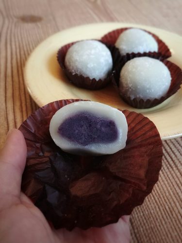 The mochi dough can be made with both shiratamako and mochiko flour. It is easier to get access to mochiko flour here in Toronto as shiratamako flour can almost only be found in Japanese grocery stores. I used Okinawan sweet potatoes for my filling because of its creamier texture and vibrant bluish purple color when cooked. These white-skin-with-mottled-purple-interior sweet potatoes contain less fibrous strings than purple sweet potatoes, making it a smoother filling. Since sweet potatoes differs in sweetness and moisture level, season them according to personal taste and add more liquids such as milk, whipping cream or water to adjust the consistency as needed.