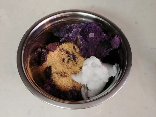 紫薯洗淨去皮後切片或切塊,隔水蒸15至20分鐘至軟後取出(EC用電子壓力煲,詳情可參考這裡),趁熱加入糖、淡忌廉及椰子油拌匀至糖溶並壓成蓉,過篩一次去掉粗粒成軟滑薯泥,以保鮮紙緊貼紫薯表面蓋好防乾備用。