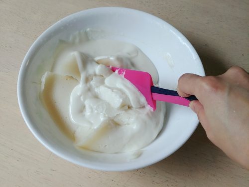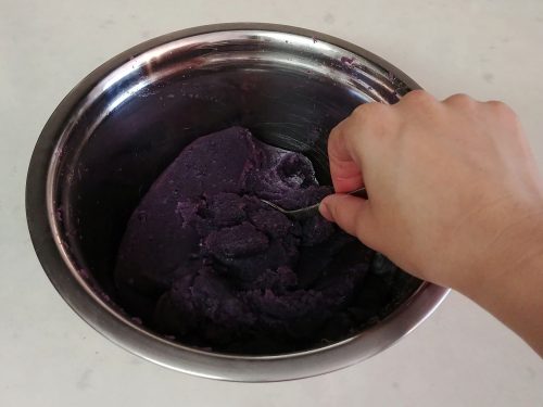 Wash and peel the purple sweet potatoes. Cut into cubes or slices and steam for 15 to 20 minutes until tender (I steamed mine with electric pressure cooker and see recipe here). Transfer freshly steamed purple sweet potatoes into a large bowl and stir in sugar, whipping cream and coconut oil until sugar has dissolved. Mash with a spoon until incorporated. Pass mixture through a medium mesh sieve for a smooth-textured filling. Press a piece of plastic wrap directly on top of the filling to prevent drying then set aside.