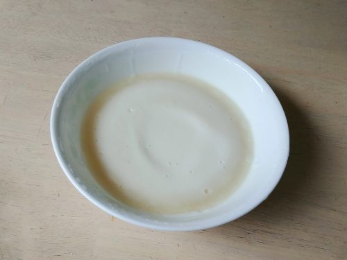 Cover bowl with plastic wrap or microwave-safe lid. Microwave on high for 2 minutes. At this time the mixture should be firm around the edges but remain runny in the center. Remove and stir well with a wet spatula. Cover and microwave again for another minute. Remove and stir to check for doneness. If the mixture has not completely set to form a dough then return to the microwave to heat in 30-second intervals. Microwave differs in wattage and model (mine is 1100W) so adjust heating time accordingly. Alternatively, pour mixture in a shallow plate and cook by steaming for 20 minutes.