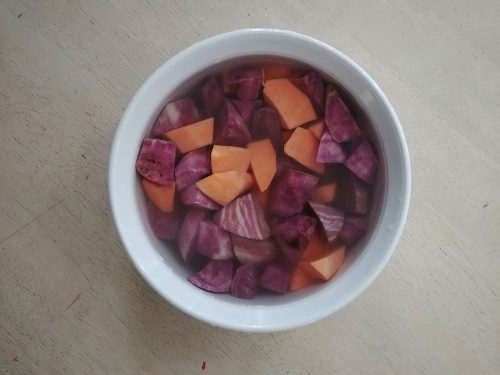 Wash, peel and cut the sweet potatoes into cubes. Place them in a large bowl and soak in water for 30 to 60 minutes. Change the water once or twice with rinsing in between to remove any starch sediment. Drain and set aside.