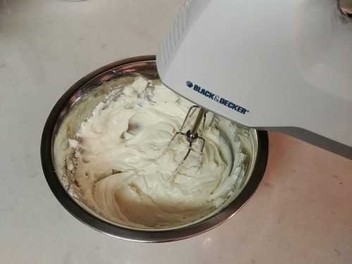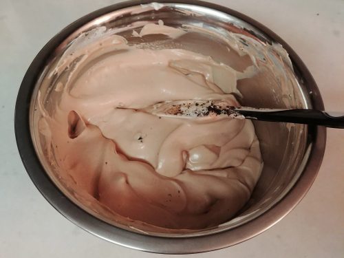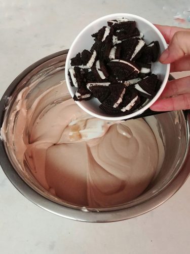 餘下淡忌廉放在預先雪凍的鋼盆中用電動打蛋器(用洗淨的配件)打至稠身及軟勾狀,分兩次加入芝士混合物中用膠刮拌匀,輕手拌入Oreo餅乾塊。