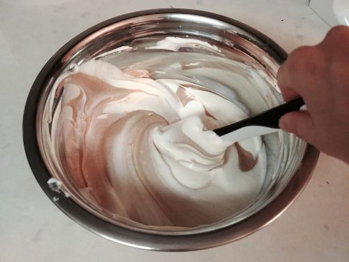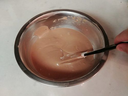 鋼盆中放入室溫忌廉芝士和糖用電動打蛋器打至順滑,加入朱古力漿及魚膠液拌至順滑。