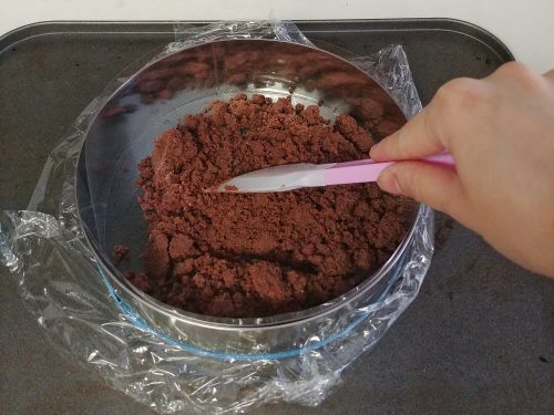 把餅乾壓碎成粉末(EC用食物處理機打粉),把餅碎放大碗中(若做瑪利餅餅底可同時加入可可粉和糖),加入牛油溶液以刮刀拌勻,倒進蛋糕圈內用匙羹背鋪平壓實,冷藏十至十五分鐘或至硬備用。
