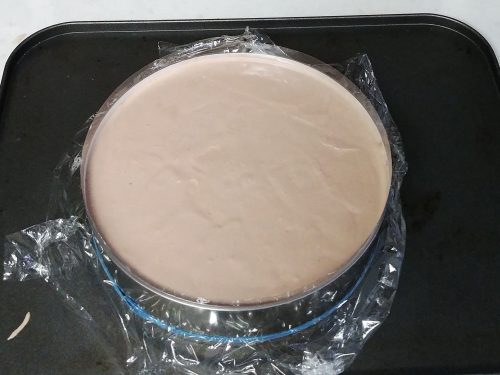 Wrap bottom of cake ring with plastic wrap. Set aside.