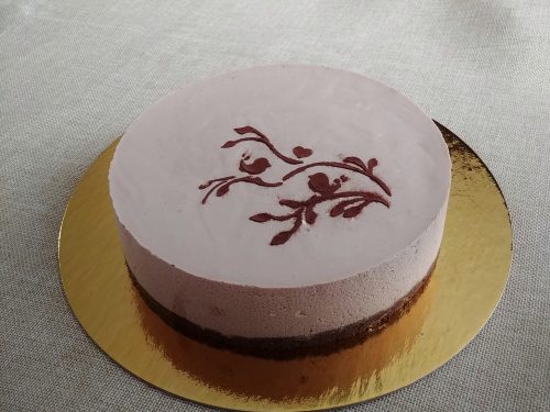 Remove cheesecake from cake ring and decorate as desired. I decorated by dusting cocoa powder over a stencil.