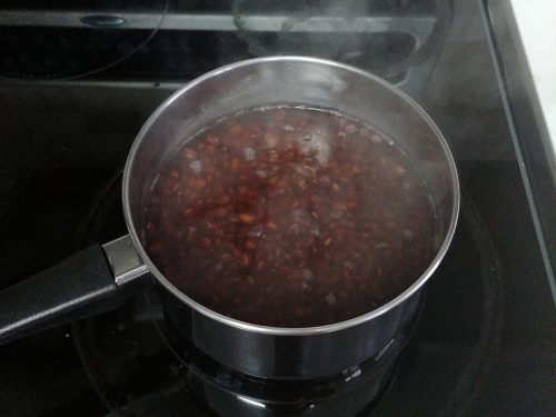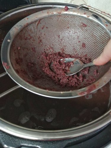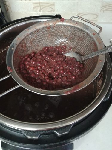 紅豆洗凈後放進小鍋中,加進蓋過紅豆的水量,煮滾後加入一杯清水,再次煮滾後離火(用Instant Pot的Sauté功能煮紅豆也可,但以爐火煮較快),倒掉水份捞出紅豆倒進大篩子內,以冷水沖洗後瀝乾,這做法可去掉紅豆內的雜質和澀味。