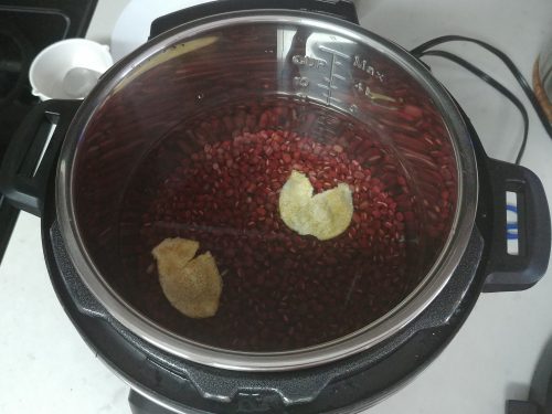 Place drained beans, dried mandarin peel and 2 liters of water (use hot water so pressure will come up faster) in the inner pot of Instant Pot. Close the lid and turn steam release handle to sealing position. Press “manual” or “pressure cook” and adjust to cook at high pressure for 35 to 40 minutes. When timer beeps, press “cancel” and let pressure release naturally (about 15 to 20 minutes). Carefully remove the lid and add in slab sugar. Press “sauté” and cook for 3 to 5 minutes until sugar dissolves. Press “cancel” to stop heating.