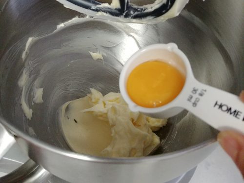 Add egg yolk and beat until fully Incorporated. Scrape down the side of the bowl with a spatula.