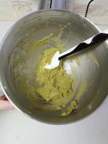 麵粉及抹茶粉混合過篩後分兩次加入牛油混合物中,用刮刀以切拌手法拌至無粉粒成軟麵糰即可,不要過度攪拌。
