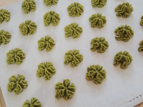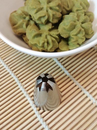 It is crucial to pay attention to the color change of the cookies during baking. Do not let the cookies brown too much as it will effect the beautiful, vivid green color (I will show you a picture of my overbaked cookies at the end of the post). Moreover, choose only Japanese matcha powder. It’s a bit pricey but, from my baking experience, Chinese and Taiwanese brands tend to be dull green in color and not as flavourful as Japanese stuffs. During my second adjustment of this recipe, I piped a thick, three tiered star shape. After baking for a full 20 minutes, I found that the cookies were still undercooked inside. I had to send them back into the oven for another 5 minutes. However, when the cookies were finally baked, the edges were too brown and the texture had become hard. Now I’ve learned a lesson not to pipe the cookie too thick.