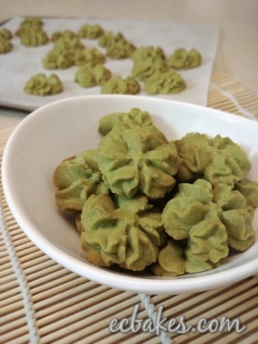 再來擠花曲奇食譜!曲奇基本配方來自維也納曲奇,EC加了抹茶粉調味。因為改用了蛋黃所以曲奇份外酥鬆。曲奇散發着淡淡綠茶香,連EC甚少吃綠茶食品的孩子們也稱讚好吃。