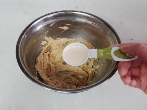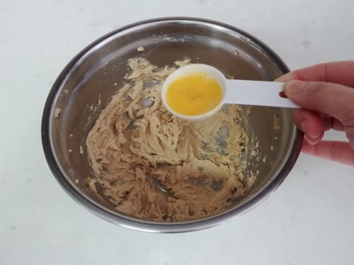 加入蛋液打至完全被吸收,再加入花奶打勻,以膠刮清理盆邊。