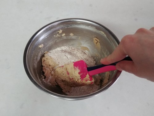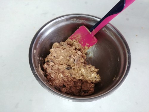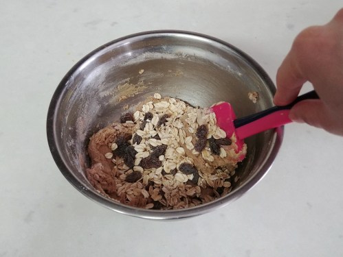 粉類分兩次加入,以膠刮拌至差不多完全混合時加入燕麥和提子乾拌勻,切勿過度攪拌。