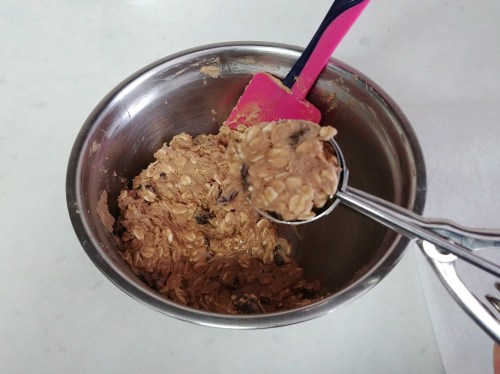 With a spatula, fold in the flour mixture in two batches. When mixture is almost blended, fold in the oats and raisins until evenly distributed. Do not overmix.