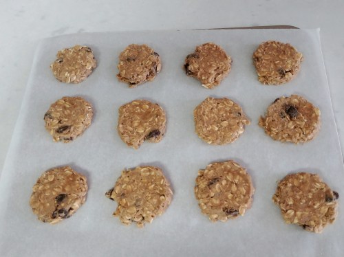 Drop rounded tablespoons of dough, about 23 g each, onto the baking sheet (I used a small ice-cream scoop). The cookies will spread in the oven so make sure to leave enough space in between them. Flatten dough slightly to about 1/4 inch thick. I covered the dough with a piece of plastic wrap before flatting as it is sticky.