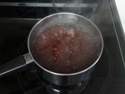 紅豆洗凈後放進小鍋中,加進蓋過紅豆的水量,煮滾後加入一杯清水,再次煮滾後離火,把紅豆倒進大篩子內,以冷水沖洗後瀝乾,這做法可去掉紅豆內的雜質和澀味。