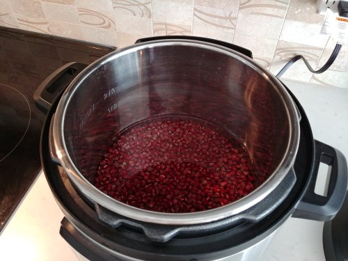 把瀝乾的紅豆放入Instant Pot內鍋,注入蓋過紅豆約半寸的清水,關上鍋蓋把排氣閥調整到密封“sealing”位置,按”bean”鍵或按“manual/pressure cook” 鍵選擇高壓煮30分鐘,煮好後按“cancel”等待自然放壓(約10分鐘),小心打開蓋子。