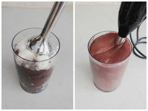 加入天然代糖和糖漿,用手提攪拌棒打成軟滑紅豆泥。