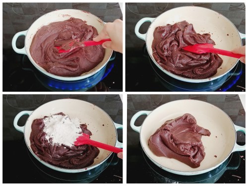 Heat a tablespoon of oil in a non-stick wok or enameled cast iron pan over medium heat. Add in the bean puree and stir with a spatula until combined. Cook with constant stirring until the paste gets thickened. Reduce to low heat and stir in the remaining oil a tablespoon a time, adding more only after the oil gets incorporated. Continue cooking and stirring until the paste clumps together and no longer sticks to the side of the wok and the spatula. Stir in the red bean powder or flour then remove from heat.