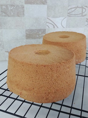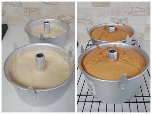 將麵糊平均倒入兩個戚風模中(模內不用抹油掃粉),將烤模往枱上輕敲幾下敲出較大的氣泡後抹平表面,入爐10分鐘焗至蛋糕表面結皮,取出蛋糕後用抹了油的薄刀在表面畫三至四條線,放回爐中繼續焗25至30分鐘或至竹籤插入蛋糕中心取出後不沾麵糊,不同焗爐可能要不同時間,請自行調節,取出後將蛋糕連烤模從半空往枱上捽一下將困於蛋糕內的空氣震破避免蛋糕回縮,在鋼架上倒扣放涼後可脫模。